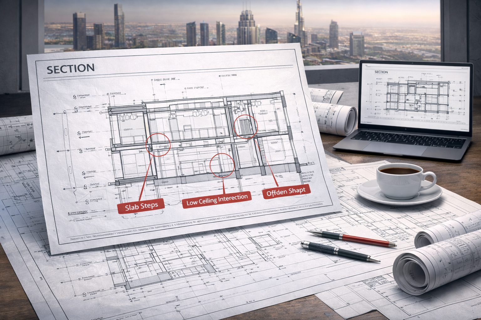 We develop as-built sections in Dubai/UAE to reveal the vertical reality of the space: slab steps, ceiling heights, soffits, shafts, and structural offsets.