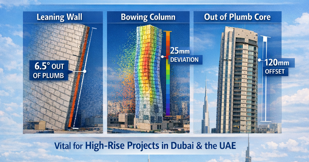 Verticality checks are especially valuable for high-rise work in Dubai and the UAE, where access is difficult and minor drift becomes major over height. It supports both structural verification and façade/fit-out coordination.