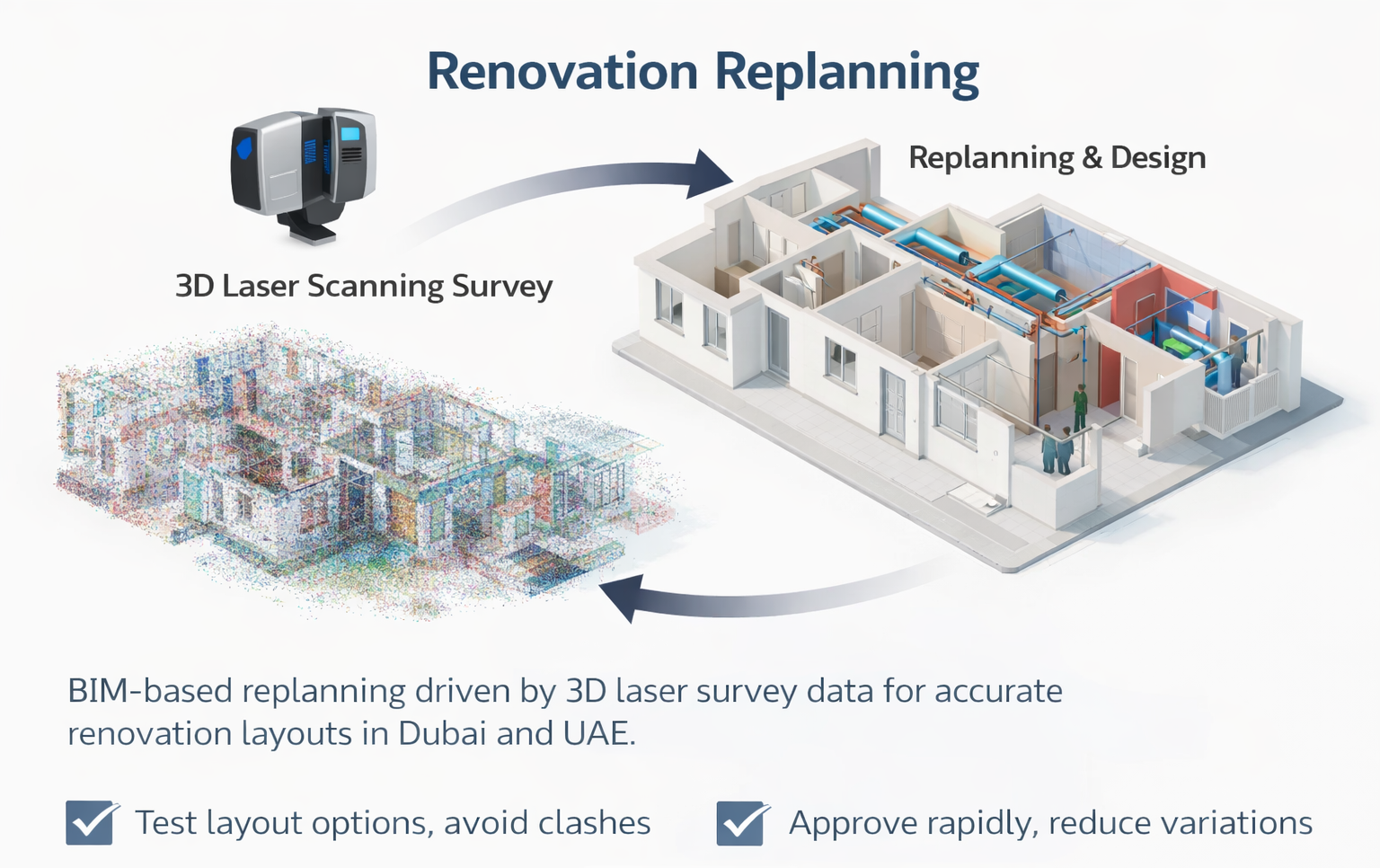 For renovation projects in Dubai and the UAE, we scan first and redesign second—so replanning is driven by verified as-built geometry from a 3D laser scanning survey. This is critical in villas and apartments where ceiling heights, structural offsets, and hidden deviations affect layout changes and MEP routing.